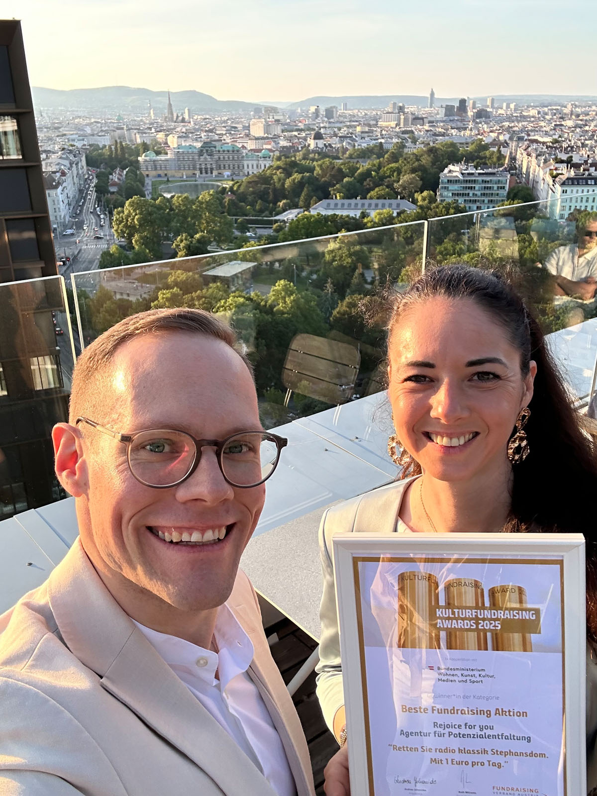 Dafür wurden radio klassik Stephansdom und wir von Rejoice for you mit dem Kulturfundraising-Award 2025 für die „Beste Kulturfundraising Aktion“ ausgezeichnet. Der Geschäftsführer von radio klassik Stephansdom, Mag. Roman Gerner, hob bei der Ehrung hervor: „Es wäre aus gewesen. Das ist sicher. Unsere große Spendenkampagne ‚Retten Sie radio klassik Stephansdom‘ hat den Weiterbestand des österreichischen Klassiksenders radio klassik Stephansdom für das Jahr 2025 gesichert. Ein riesiges DANKE an unsere Spenderinnen und Spender und an ‚Rejoice for you – Agentur für Potenzialentfaltung‘, die uns seit Beginn im Fundraising maßgeblich unterstützt.“